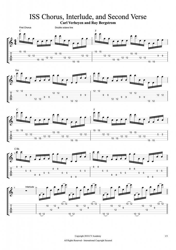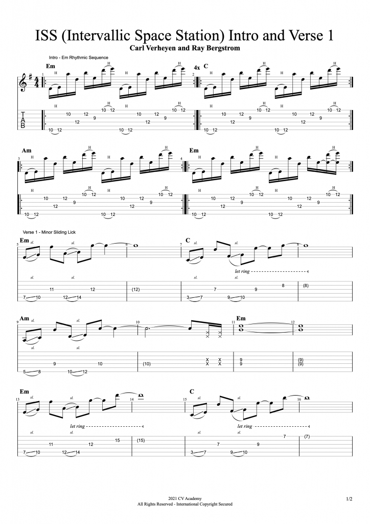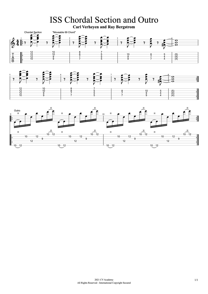 “ISS (Intervallic Space Station)” is a hard-hitting synth rocker inspired by the sounds of the 80s. It opens with a hypnotic hybrid picking rhythmic sequence that recurs throughout the tune. The verse melody is based on signature Verheyen intervallic lines. The chorus has a rhythmic string-skipping sequence in octaves over shifting chords. Finally, a chordal section features floating, spacey three-note chord voicings.